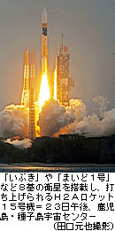 三菱重工業と宇宙航空研究開発機構は23日午後零時54分、鹿児島・種子島宇宙センターからH2Aロケット15号機を打ち上げた。15号機は主衛星の温室効果ガス観測技術衛星「いぶき」を目標の地球周回軌道に投入し、打ち上げは成功した。東大阪の町工場が部品を作った「SOHLA-1」(まいど1号)など相乗りの小型副衛星7基も順次分離する。同時に計8基も打ち上げるのは日本で初めて。