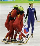 レースは終盤、五輪5連覇を狙う韓国と、世界記録を持つ中国とのマッチレースに。最後は韓国が中国を引き離して1位でゴールし、10代を中心にした若い韓国選手らはコーチ陣と抱き合い、国旗を掲げてリンクを周回した。