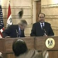 電撃的に訪問していたらしい、イラクのバクダッドで会見をしている時に、米国ブッシュ大統領がイラク人記者より、靴を投げつけられるハプニングが発生している。