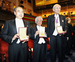 12月10日、スウェーデン・ストックホルムのコンサートホルムで開かれたノーベル賞の授賞式により、日本人受賞者4氏がメダルと賞状を受取られた。