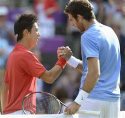 テニスの男子シングルス準々決勝が2日(日本時間3日未明)行われ、錦織圭(日清食品、世界ランキング17位)は同9位のフアンマルティン・デルポトロ(アルゼンチン)と対戦、4-6、6-7で敗れた。日本人選手として92年ぶりのベスト4を目指したが、かなわなかった。 錦織は第1、第2セットともデルポトロにゲームを連取される苦しい立ち上がり。第2セットをタイブレークに持ち込むなど終盤で驚異の粘りを見せたが、一歩及ばなかった。 錦織は2回戦で同48位のニコライ・ダビデンコ(ロシア)を、3回戦では格上のダビド・フェレール(スペイン、同5位)に競り勝ってきたが、「五輪3勝でベスト4」は実現できなかった。