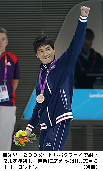 【ロンドン時事】ロンドン五輪は第5日の31日、競泳男子200メートルバタフライ決勝が行われ、松田丈志(コスモス薬品)が2大会連続の銅メダルを獲得した。男子200メートル平泳ぎでは、100メートルで5位だった北島康介(日本コカ・コーラ)が全体5位、立石諒(NECグリーン)は7位で決勝に進んだ。女子200メートルバタフライの星奈津美(スウィン大教)も決勝に進出。マイケル・フェルプス(米国)が2個のメダルを取り、通算メダル獲得数を史上最多の19個とした。