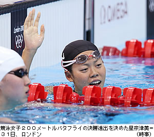 (時事通信2012/08/01) 200mバタフライでは女子でもメダル獲得の可能性を感じさせる様になってきた。準決勝を3位で突破した星。彼女は、準決勝の当日は何やらコンディションが良くなかった様で、競技前までに何度か調整した。だから、泳ぎも決して良いとは言えないと語っていたのではなかったろうか。 だから、決勝には万全のコンディションで挑むことが出来れば、松田と同じ様に改心の泳ぎをする事が出来れば、入賞は当然だと思うけど3位以上の可能性は十分にあるんじゃないか。 準決勝では3位に終わっているけど、もしかしたらそれ以上の成績を残すことが出来るのかもしれない。だが、決勝ではどの様な成績になろうと悔いを残さない事を目指して泳ごうとしている筈。 成績を意識するよりも、自分にとって悔いの残らない泳ぎをしてもらいたい。頑張ってもらいたい。