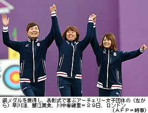 アーチェリー女子団体の日本が銅メダルに輝いた。女子では五輪で初のメダル。大歓声の中、早川、蟹江、川中の3人は喜びに浸った。