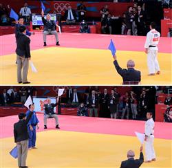 いったん上がった3本の青旗。しかし協議後に3人の審判が掲げた旗は数分前と正反対の白3本だった。異例の旗判定やり直しで海老沼匡の勝利となった男子66キロ級の準々決勝。対戦相手の韓国、●準好(チョ・ジュンホ)(23)の応援団は激高、海老沼の応援団は日の丸を振り、会場は騒然となった。 海老沼は積極的に攻めたが延長戦にもつれ込み、勝敗は判定に。●の勝利を示す青い旗が上がると、何度も周囲を見回し、信じられないという表情。海老沼のコーチは「なぜ」と両手を広げた。2000年のシドニー五輪で、誤審によって敗退した経験を持つ柔道男子の篠原信一監督(39)もスタンドから眉間にしわを寄せ、大声で判定の再考を求めた。観客のブーイングが広がる。主審と副審2人が審判委員に呼び寄せられ、協議を続けた。 数分後、逆転の白い3本の旗が上がった。観客席で見守った母親の道子さん(52)は、判定が覆ると手をたたいて笑顔に。今度は韓国側からブーイングが起き、●とコーチは呆然(ぼうぜん)と立ちつくした。 審判委員制度に詳しい国士舘中学・高校柔道部の川野(かわの)一成(かずなり)総監督(68)は「これほどまでに判定が覆るのは異例中の異例だ。国際試合での審判技術の未熟さを痛感した」と話した。