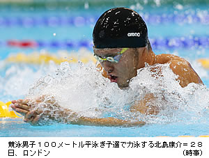 競泳は28日、6種目の予選が行われ、3大会連続2冠を目指す北島康介(日本コカ・コーラ)は男子100メートル平泳ぎで59秒63の全体2位で、午後の準決勝に進んだ。立石諒(NECグリーン)も8位で予選を突破。 男子400メートル個人メドレーの萩野公介(御幸ケ原SS)は4分10秒01の日本新記録で1位。堀畑裕也(日体大)が7位、北京五輪8冠のマイケル・フェルプス(米国)は8位で決勝に進んだ。 女子100メートルバタフライは加藤ゆか(東京SC)が予選通過し、星奈津美(スウィン大教)は予選落ち。同400メートル個人メドレーの大塚美優(スウィン大宮)、高橋美帆(日体大)は決勝に進めなかった。